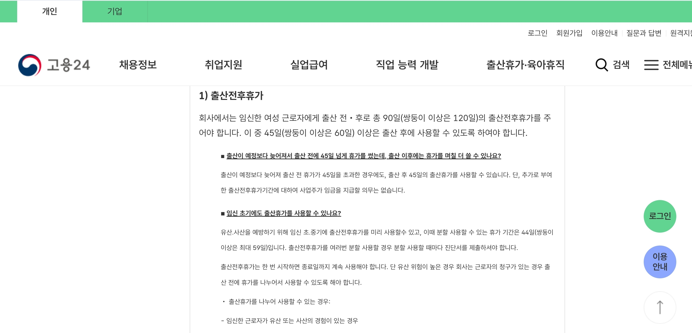 시기 : 출산 전후 총 90일 (출산 전 45일 + 후 45일 권장) 자녀가 만 8세 이하 또는 초등 2학년 이하일 때