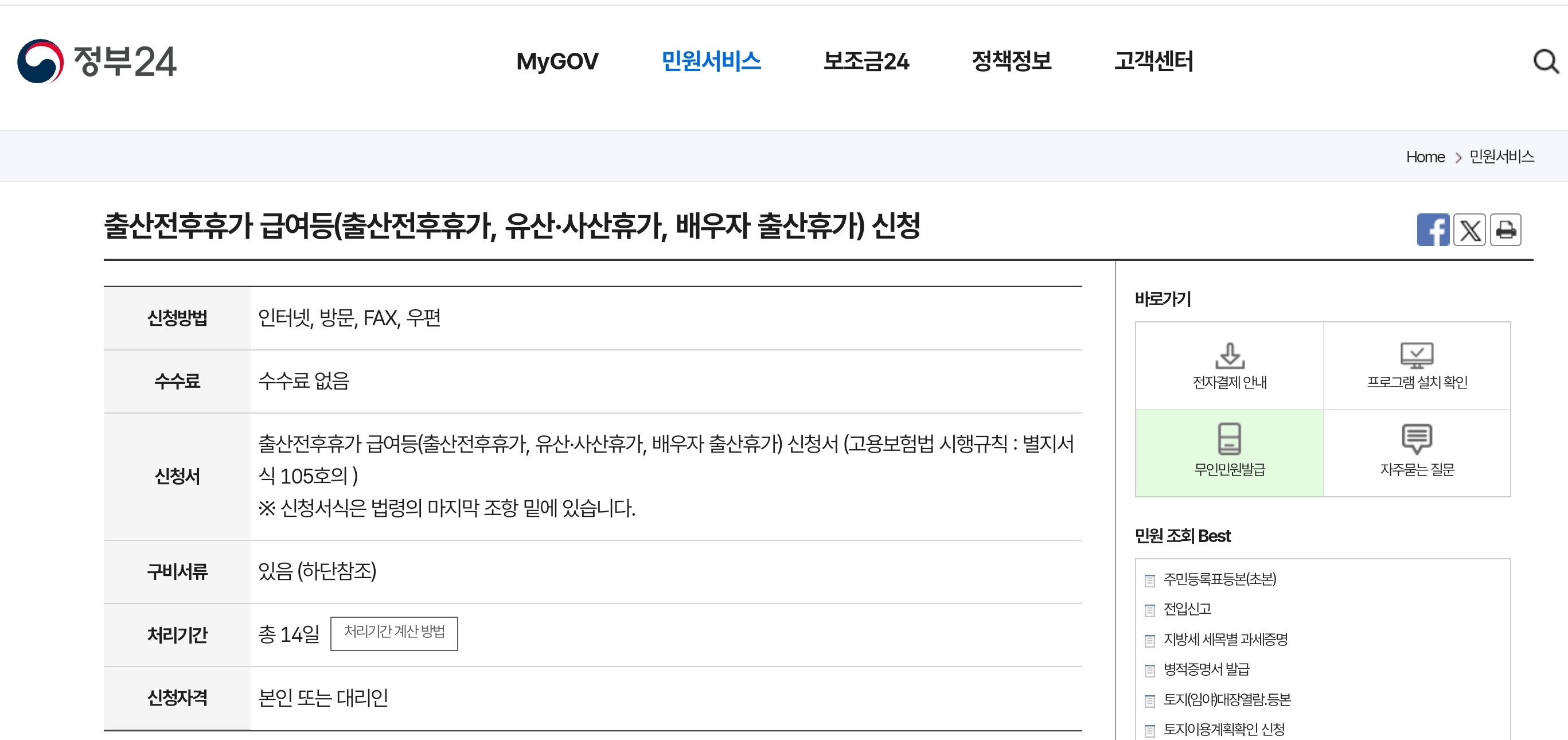 출산휴가 급여 신청서 (홈페이지에서 작성 가능)